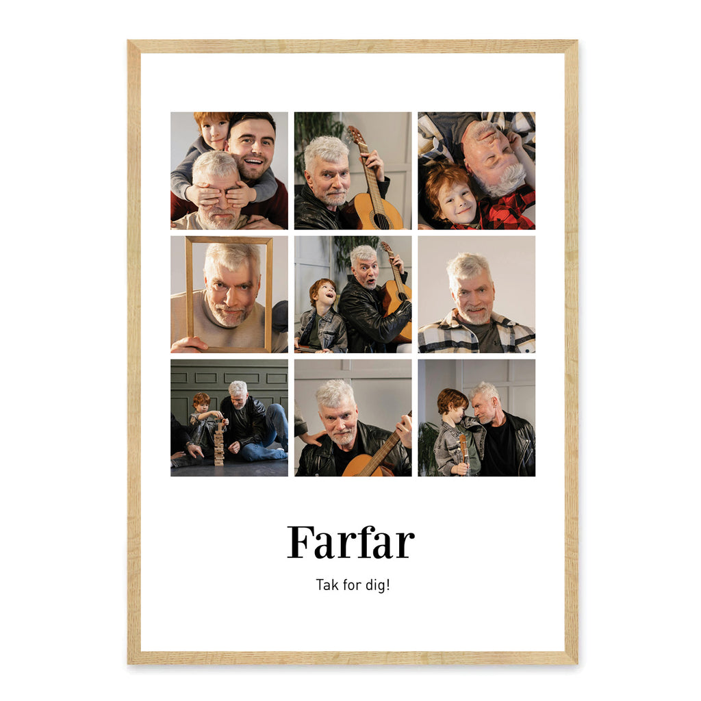 Overrask din farfar med en personlig plakat, der hylder hans varme, visdom og de minder, I deler. Denne plakat fanger både de sjove øjeblikke og de stille stunder, der gør jeres relation helt særlig. Plakaten kan tilpasses med dine egne 6 eller 9 billeder, en personlig overskrift og tekst, som fortæller hans helt unikke historie.