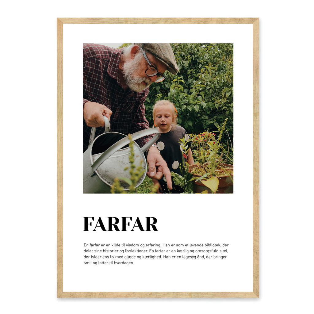 En Farfar-plakat er en kærlig måde at hylde det helt særlige bånd, du har til din farfar. Den fanger de minder, grin og små øjeblikke, der har formet jeres relation gennem årene – fra barndommens historier til de hyggelige stunder i hverdagen. Plakaten viser på smukkeste vis, hvor stor en rolle han spiller i dit liv, og hvor meget hans kærlighed og nærvær betyder.