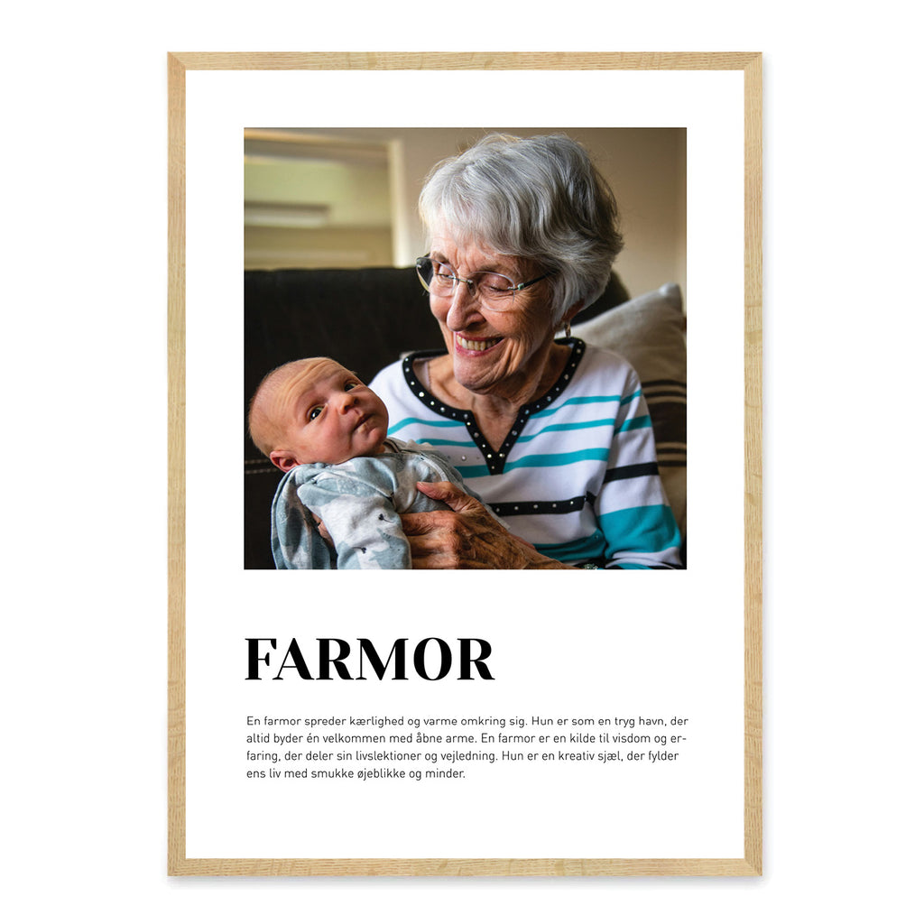 En Farmor-plakat er en varm og kærlig måde at hylde det helt særlige bånd, du har til din farmor. Den fremhæver de hyggelige stunder, små grin og minder, I har delt gennem årene – fra barndommens fortællinger til hverdagens kærlige øjeblikke. Plakaten viser, hvor meget hun betyder, og hvor stor en rolle hun spiller i dit liv.