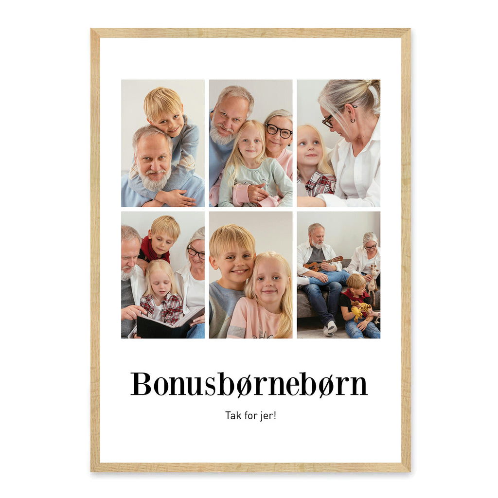 At få bonusbørnebørn er en gave i sig selv – et bånd der vokser frem af nærvær, nysgerrighed og de særlige stunder, I har skabt sammen. Denne plakat giver plads til netop de øjeblikke, der gør relationen unik, uanset om det er fjollede grin, ferieminder eller små hverdagsskatte. Plakaten kan designes med 6 eller 9 billeder, en personlig titel og tekst, så den afspejler jeres helt særlige familiehistorie.