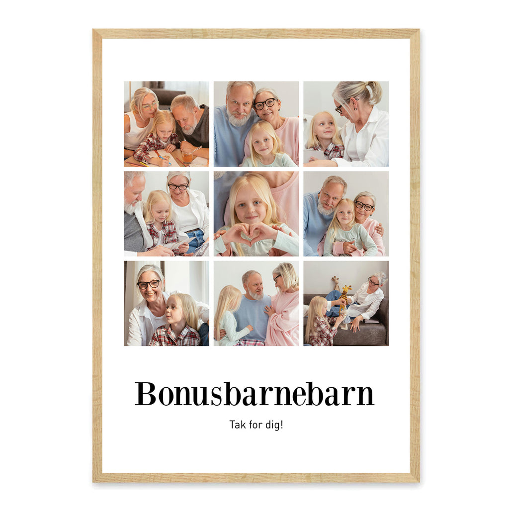 En hjertevarm plakat skabt til at fejre det særlige bånd du har til dit bonusbarnebarn. Den hylder de minder, kærlighed og oplevelser, der gør jeres forhold unikt og værdifuldt. Plakaten kan tilpasses med dine egne 6 eller 9 billeder, en personlig overskrift og tekst, som fanger jeres helt specielle historie og de øjeblikke, I deler.