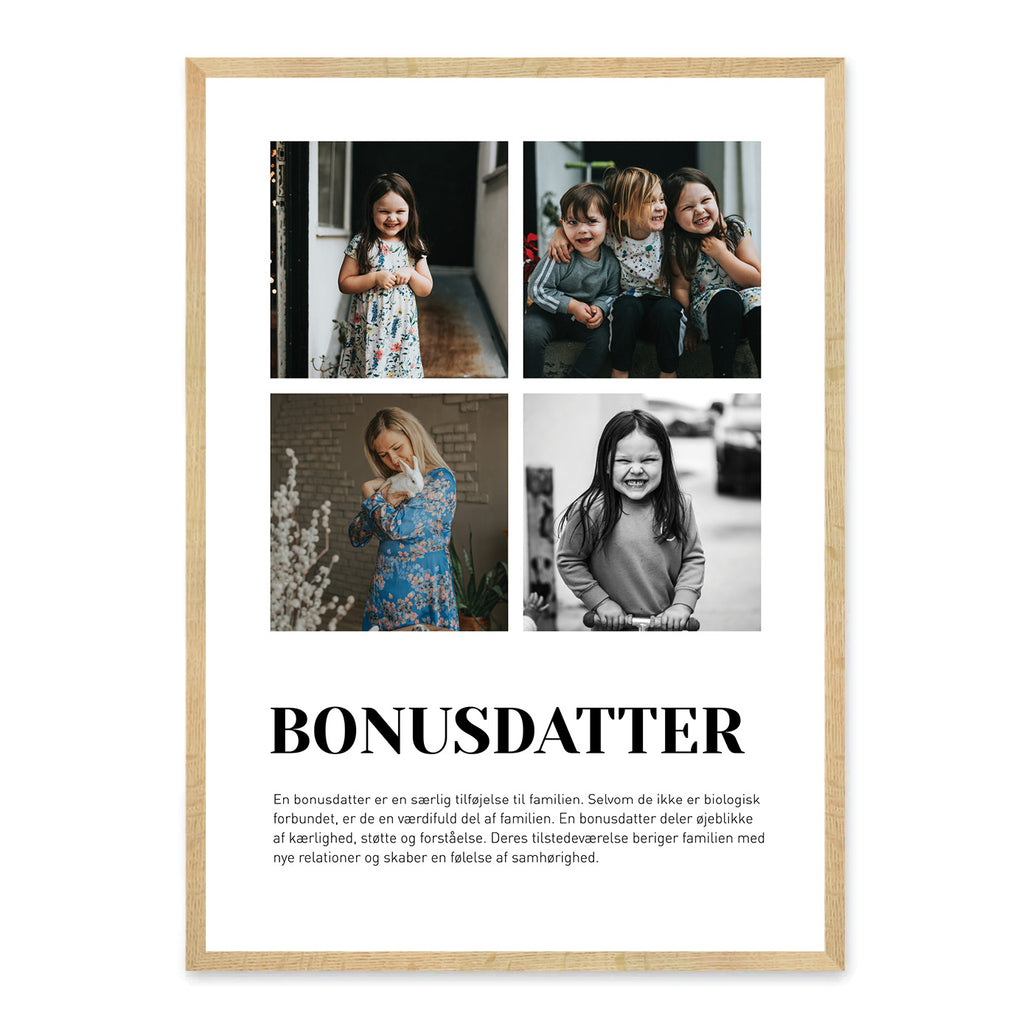 Vælg mellem et design med ét eller fire billeder, og tilføj en færdig tekst fra vores liste – eller skriv din egen. En rørende og betydningsfuld gaveidé til bonusdatteren, som vil værdsætte en personlig og kærlig påmindelse om, hvor meget hun betyder for dig.