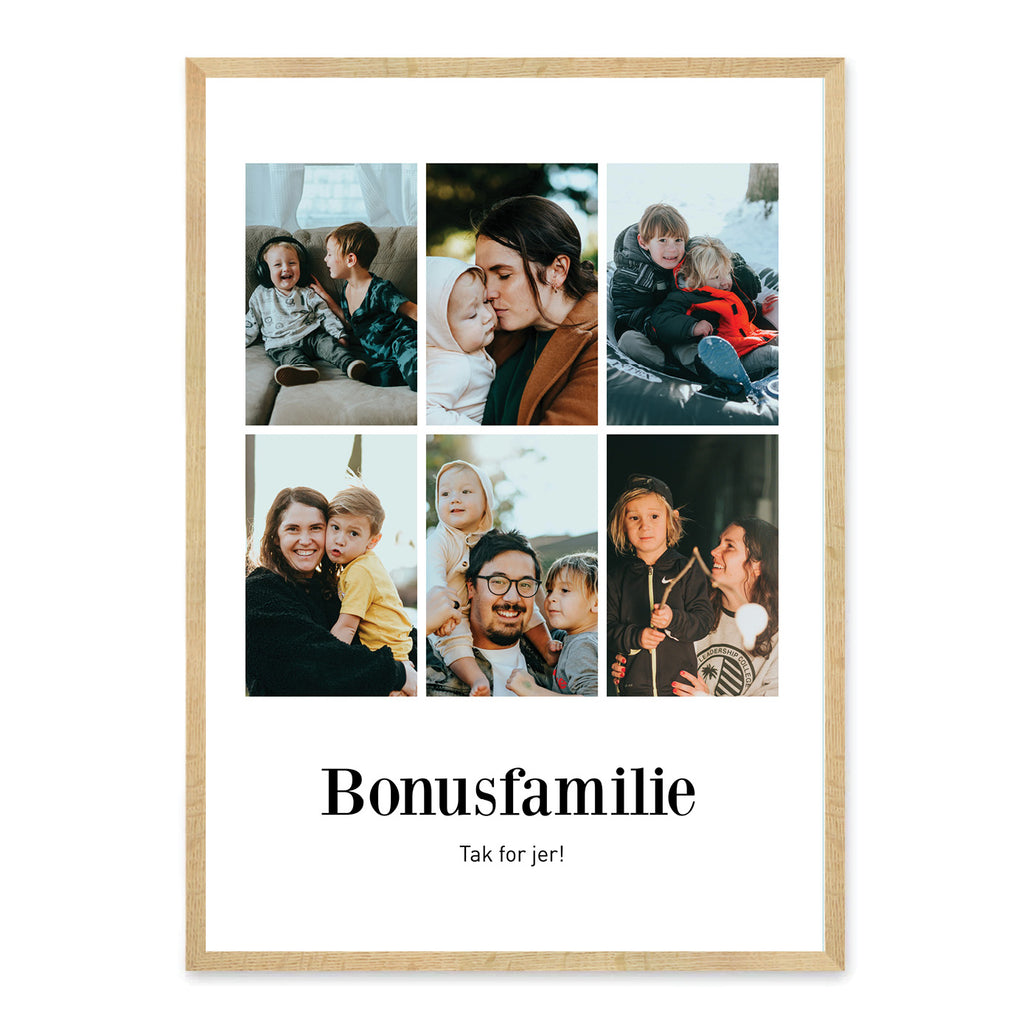 En bonusfamilie bliver til gennem mod, generøsitet og alle de øjeblikke, hvor man vælger hinanden – også på de dage, hvor livet ikke er helt lige til. Denne plakat hylder den smukke og patchwork-lignende kærlighed, der vokser, når nye mennesker flettes ind i ens hverdag og bliver en del af noget større. Her kan I samle 6 eller 9 billeder, en personlig titel og jeres egen tekst, så plakaten afspejler alt det, der gør netop jeres familie helt særlig.
