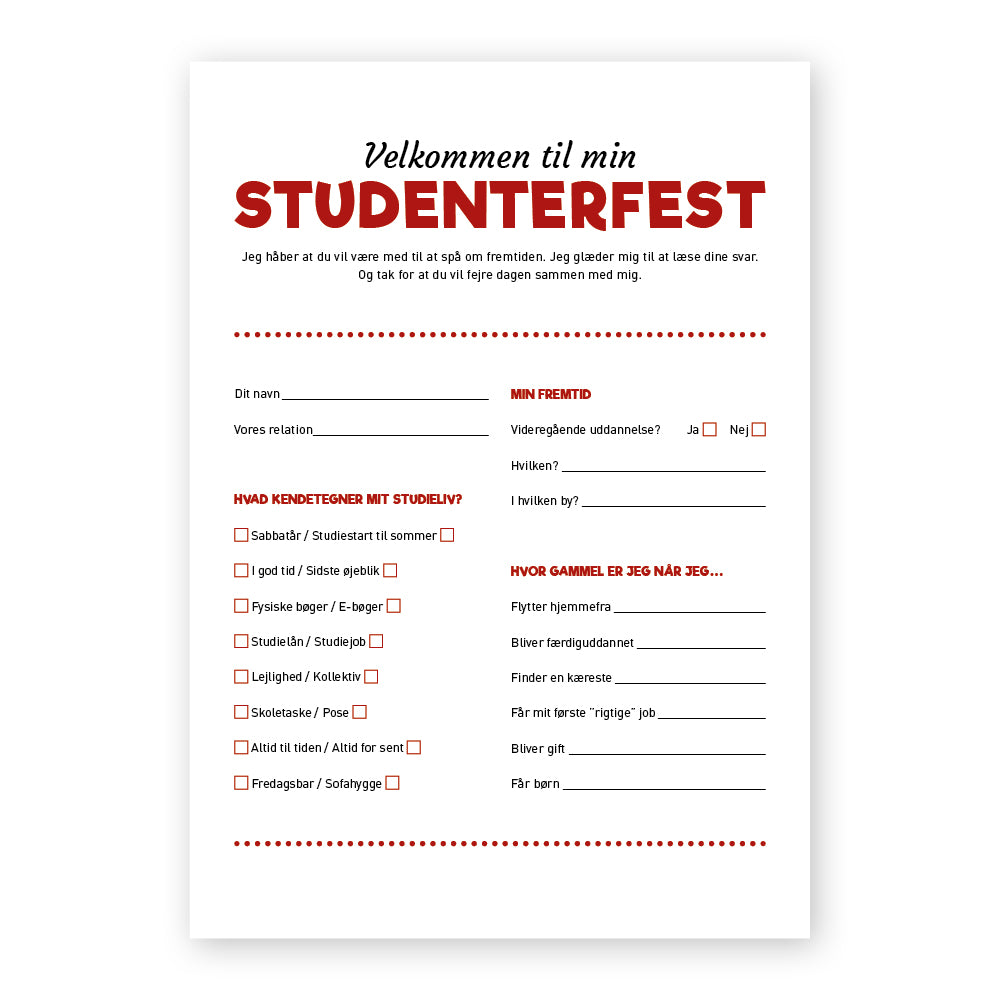 Gæsterne besvarer sjove og finurlige spørgsmål om studentens fremtid. Det fungerer perfekt som en festlig aktivitet eller icebreaker, og quizzerne bliver til et skønt minde, som studenten kan gemme for evigt.