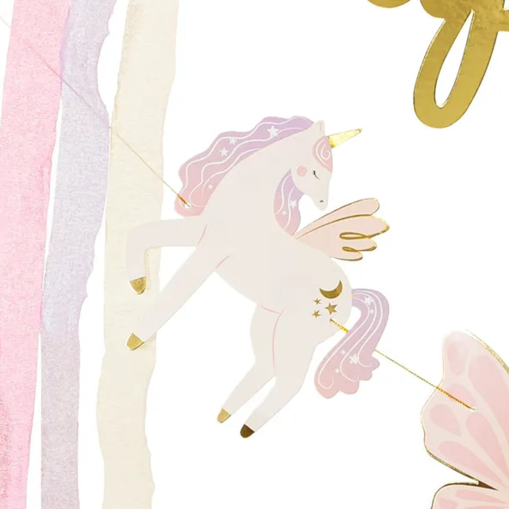 Eventyrligt DIY-banner med teksten "Happy Birthday" og søde enhjørningemotiver i et mix af glade farver. Ideel dekoration til børnefødselsdage med enhjørningetema eller andre magiske fejringer.