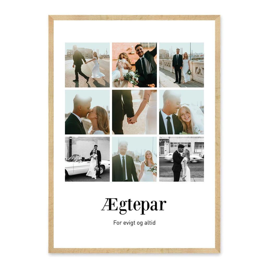 Denne smukke plakat er skabt som en personlig og kærlig gave til et ægtepar. Den fejrer det fællesskab og den kærlighed, der binder jer sammen gennem livet – fra de små hverdagsøjeblikke til de store milepæle. Plakaten kan tilpasses med jeres egne 6 eller 9 billeder, en personlig overskrift og tekst, så den fortæller jeres helt unikke historie.