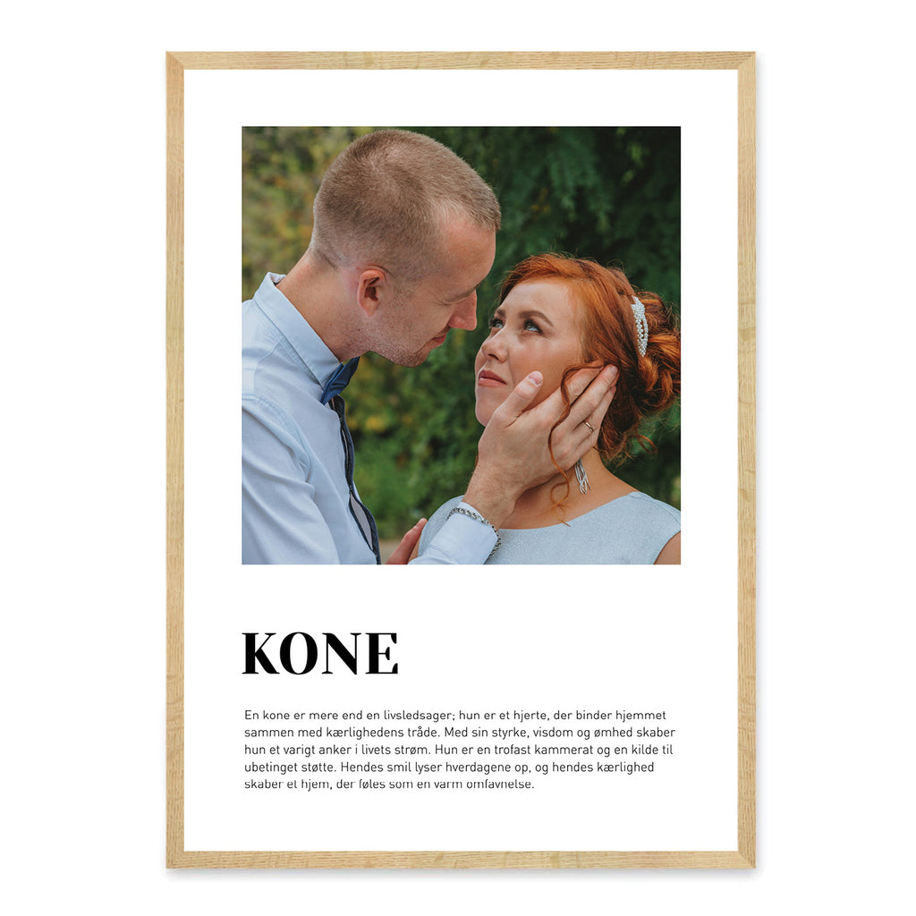 En Kone-plakat er en smuk og kærlig måde at hylde den kvinde, der deler dit liv, dine drømme og dine vigtigste øjeblikke. Den indfanger både hverdagsvarmen, de store minder og de små glimt af kærlighed, der gør jeres forhold helt unikt. Plakaten er en rørende måde at vise, hvor meget din kone betyder for dig, og hvor dybt hendes tilstedeværelse præger dit hjerte og din hverdag.