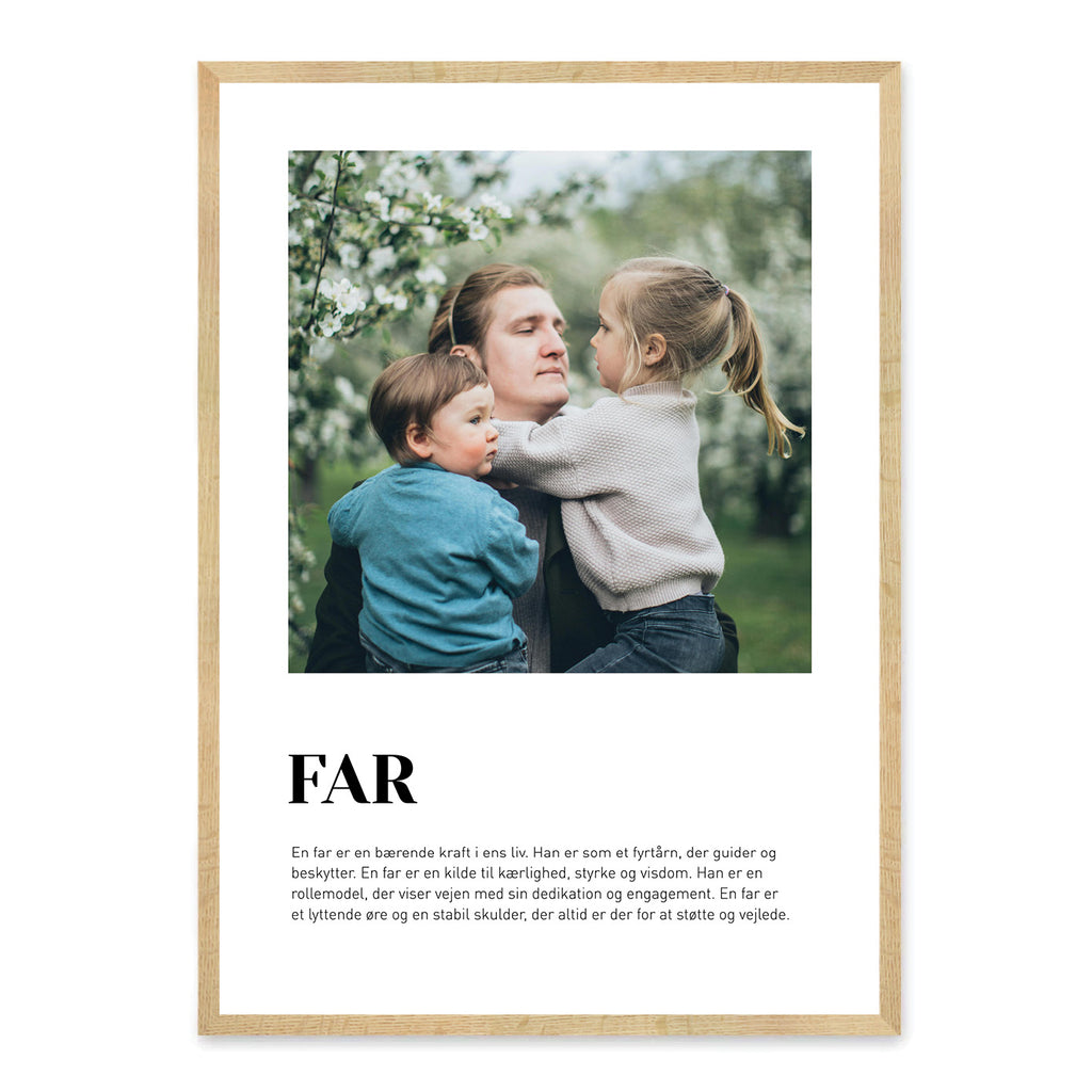 En Far-plakat er en smuk måde at hylde den mand, der har stået ved din side gennem hele livet. Den indfanger de minder, grin og hjertevarme øjeblikke, som har formet jeres relation – fra barndommens trygge stunder til de små, vigtige øjeblikke i hverdagen. Plakaten er en kærlig påmindelse om alt det, der gør jeres bånd helt særligt, og om den styrke og omsorg, han har givet dig gennem årene.