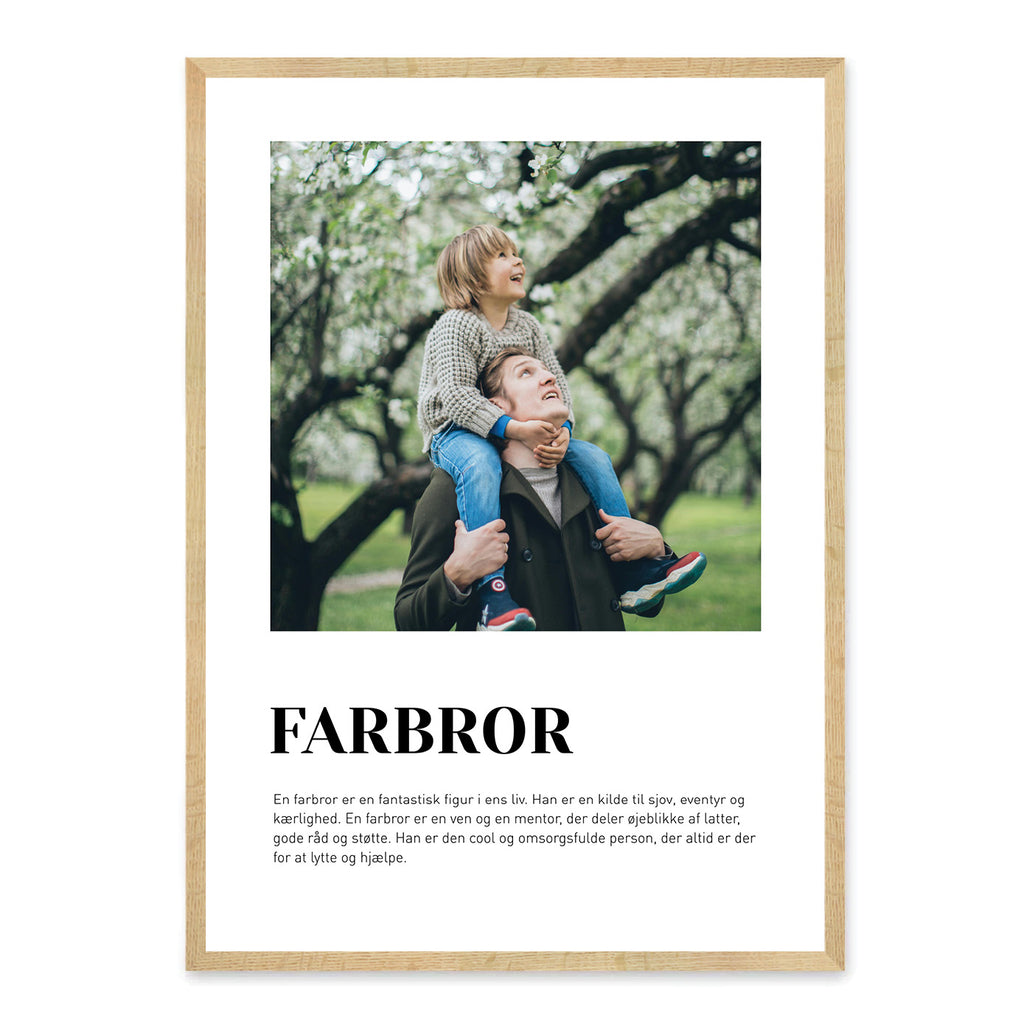 En Farbror-plakat er en kærlig måde at hylde den helt særlige relation, du har til din farbror – uanset om I har delt barndomsminder sammen eller først har knyttet bånd senere i livet. Den fremhæver de grin, minder og små øjeblikke af nærhed, der binder jer sammen som familie. Plakaten er en smuk måde at vise, hvor meget han betyder, og hvor stor en rolle han spiller i dit liv.