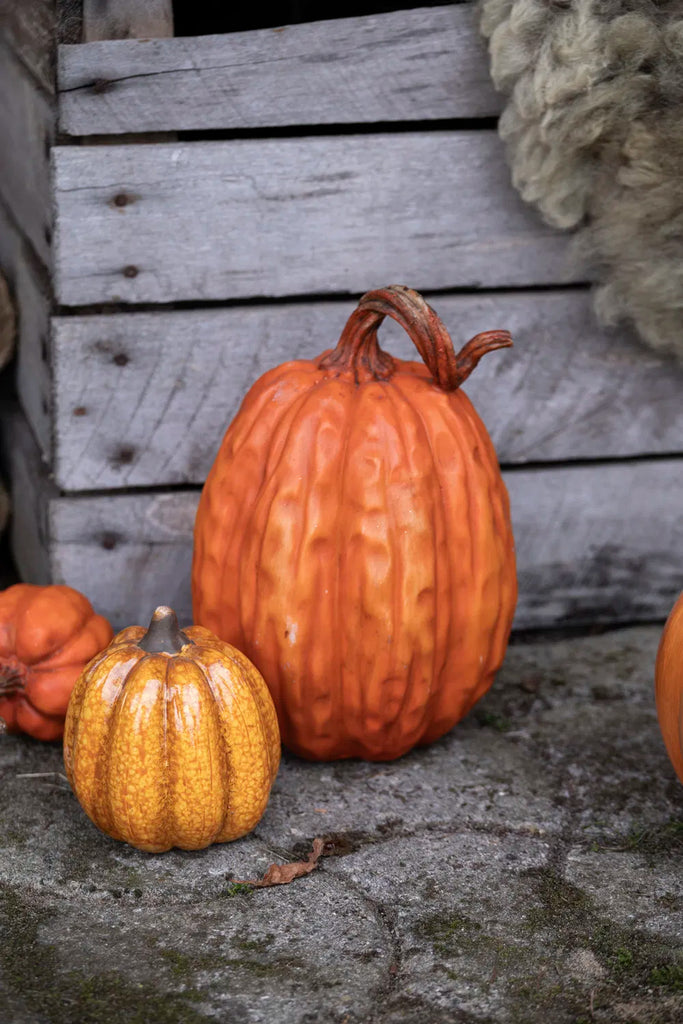 Med målene H 9,3 cm x Dia. 8,3 cm har græskaret en praktisk størrelse, der gør det ideelt som bordpynt, vinduesdekoration eller som del af en smuk efterårs- og Halloweenopstilling. Den gyldne orange farve fremhæver efterårsstemningen og passer perfekt sammen med både naturlige materialer og andre dekorative græskar.
