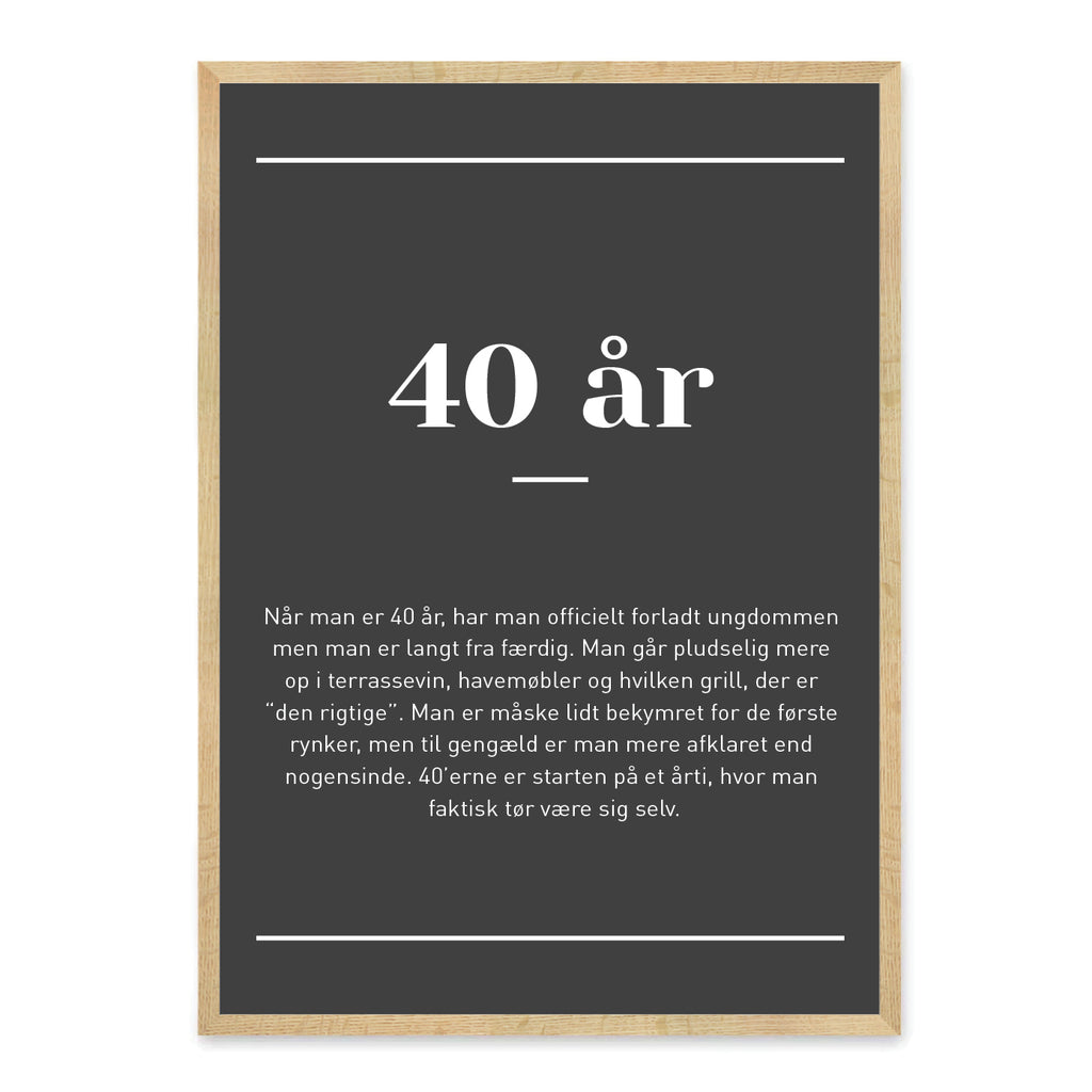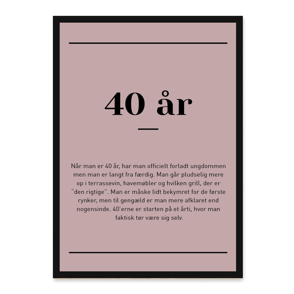 40 år – en milepæl, hvor man har samlet livserfaring, selvironi og stadig evnen til at grine af det hele. Denne plakat beskriver med kærlig humor det særlige ved at runde 40 – en alder hvor man kender sine grænser, men stadig tør bryde dem (når det passer én).