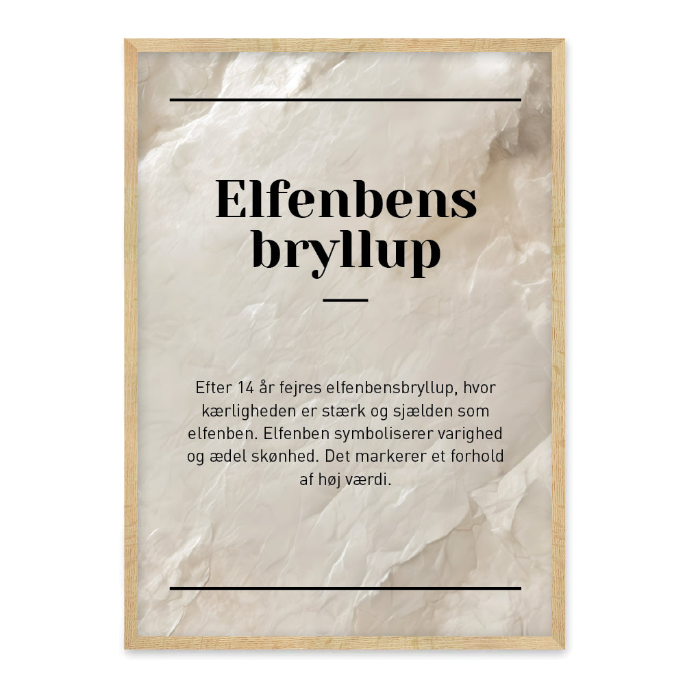 Plakaten er en oplagt gave til ægtefællen eller til et par, der markerer deres elfenbensbryllup. Teksten hylder et ægteskab, der er både værdifuldt og varigt – et smukt minde om 14 års kærlighed.