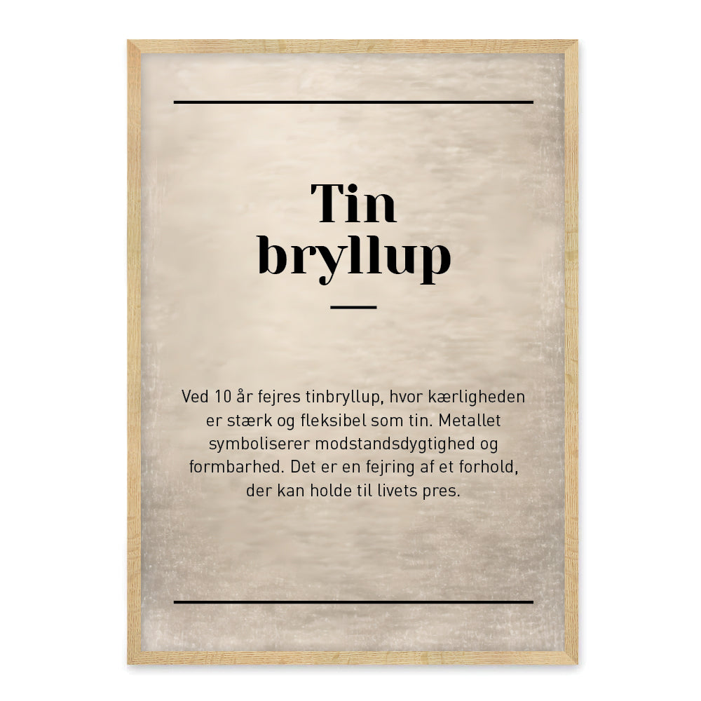 Fejr et årti fyldt med kærlighed med denne smukke Tinbryllup plakat. Efter ti år symboliserer tin styrke, fleksibilitet og modstandsdygtighed – præcis som et ægteskab, der har bevist sin holdbarhed gennem livets glæder og udfordringer.