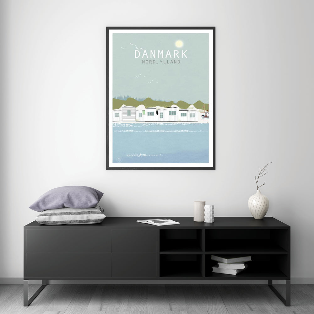 En flot Nordjylland plakat, lavet af kunstner og grafiker Lydia Wienberg. Lydia Wienberg har sin egen legende stil, hvor der er flotte farver på hendes plakater. Hun er uddannet som kunstner i Tyskland og tog derefter grafiker uddannelsen, og der siden 2012 designet by plakater fra hele landet.