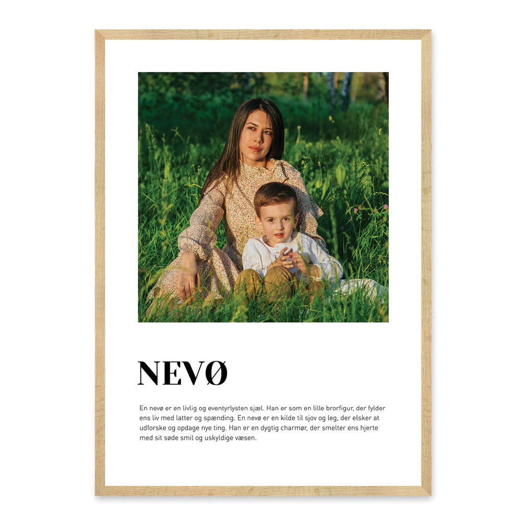 En Nevø-plakat er en kærlig måde at hylde den helt særlige relation, du har til din nevø. Den fremhæver de minder, grin og små øjeblikke af nærhed, der binder jer sammen som familie, og viser, hvor meget han betyder, og hvor stor en rolle han spiller i dit liv. Plakaten er en smuk måde at vise, hvor stolt du er af ham, og hvor meget du holder af jeres særlige bånd.