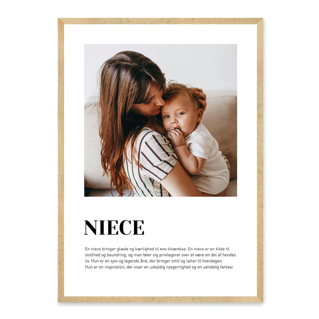 Gør plakaten personlig ved at vælge en færdig tekst eller skrive din egen, og upload ét eller fire billeder, der fortæller jeres historie. En oplagt gaveidé til fødselsdag, jul eller som en varm og personlig overraskelse, der viser, hvor højt du værdsætter din niecen. Det stilrene, nordiske design gør den til et tidløst minde, der kan pryde ethvert hjem.