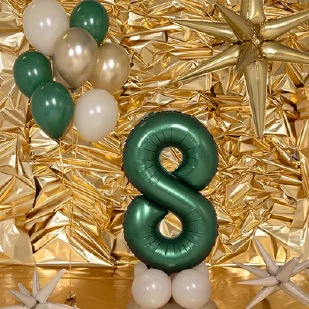 Folieballon med tallet "8" i flaskegrøn farve. Giv din fest et stilfuldt præg med denne elegante tal folieballon. Den satinagtige overflade og den dybe grønne nuance giver ballonen et eksklusivt udtryk, der passer perfekt til enhver festlig anledning. Ballonen måler 86 cm i højden og tilføjer et flot og iøjnefaldende dekorativt element til din fejring.