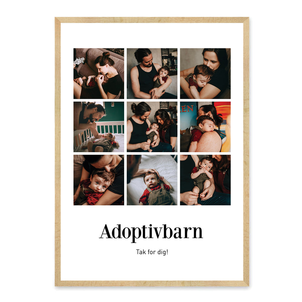 Denne smukke plakat er skabt som en varm og personlig gave til et adoptivbarn. Den minder om, at familie ikke handler om blod, men om kærlighed – og om det stærke bånd, der vokser, når man vælger hinanden med hjertet. Plakaten kan tilpasses med dine egne 6 eller 9 billeder, en personlig overskrift og tekst, så den fortæller jeres helt særlige historie