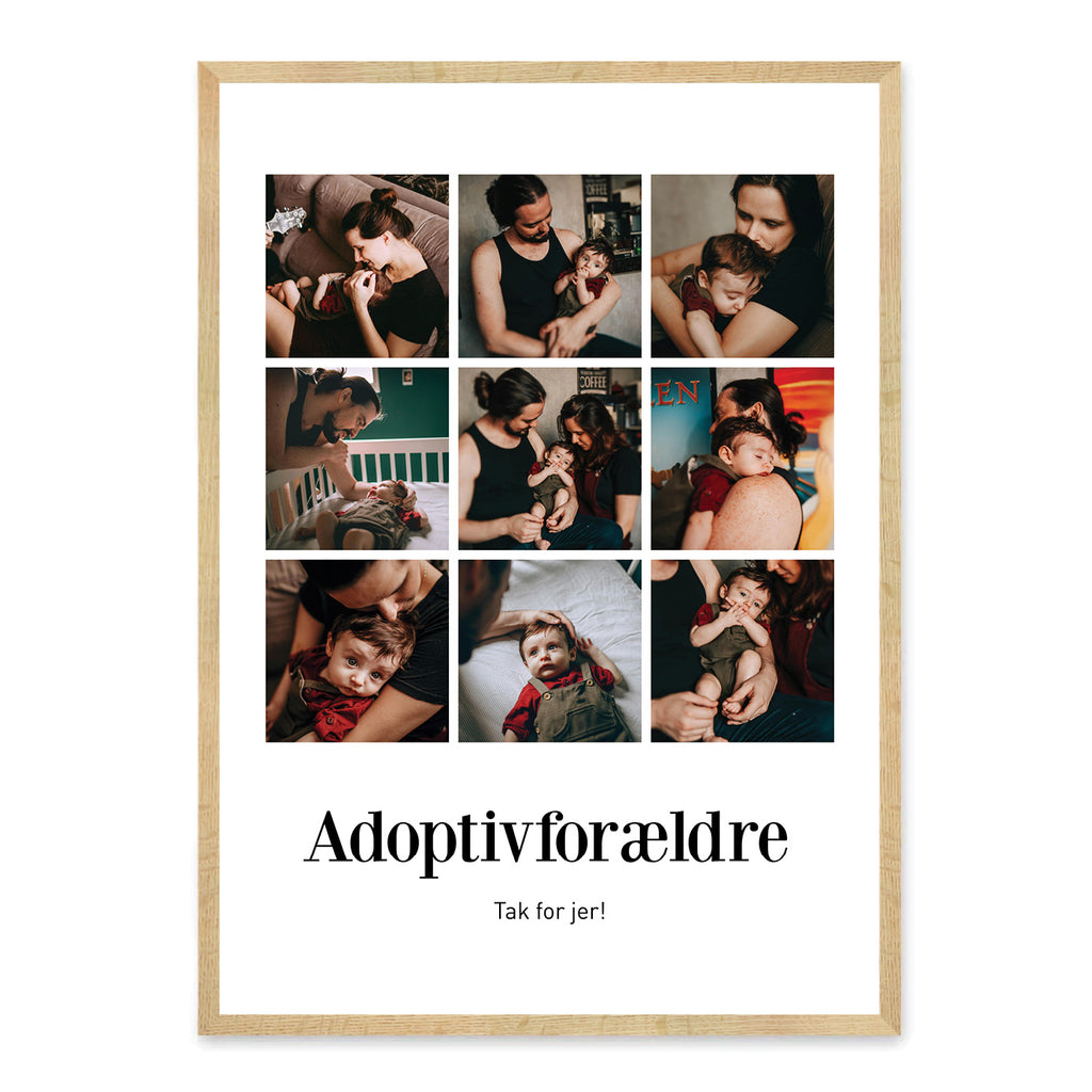 Denne smukke plakat er skabt som en personlig og kærlig gave til dine adoptivforældre. Den fejrer den særlige kærlighed og dedikation, der gør, at familie kan skabes på tværs af afstand og oprindelse, og det bånd, der vokser, når man vælger hinanden med hjertet. Plakaten kan tilpasses med dine egne 6 eller 9 billeder, en personlig overskrift og tekst, så den fortæller jeres unikke historie som familie.