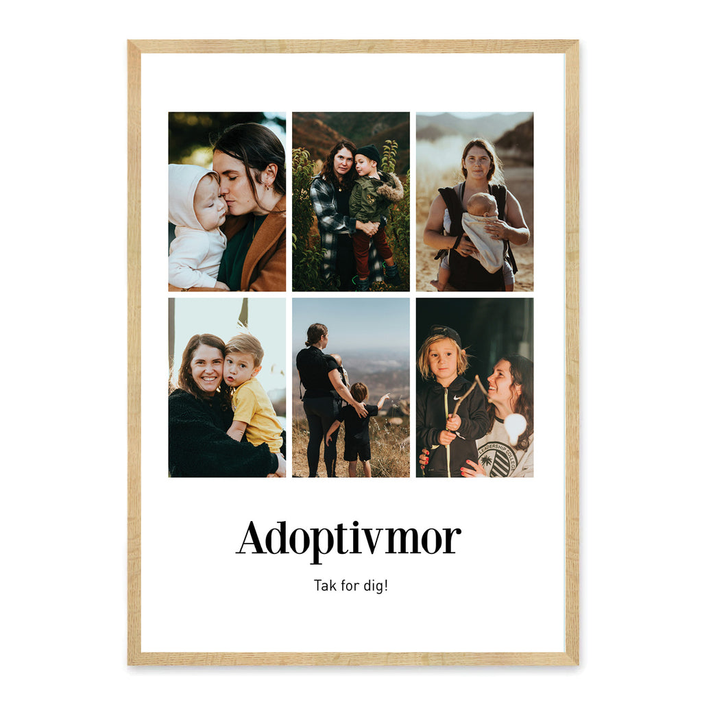 Denne plakat er skabt som en kærlig hyldest til adoptivmødre, der bærer deres familie i hjertet længe før den findes i hænderne. En adoptivmor giver tryghed, tålmodighed og en særlig form for kærlighed, der vokser gennem både drømme, beslutninger og hvert lille øjeblik, der følger. Med mulighed for at tilføje 6 eller 9 billeder kan du samle de minder, der bedst fortæller jeres historie og gøre den til et smukt symbol på jeres fælles rejse.
