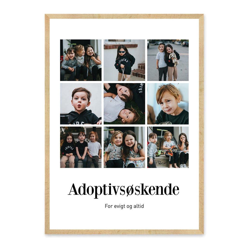 Denne smukke plakat er skabt som en personlig og kærlig gave til adoptivsøskende. Den fejrer det stærke bånd, der vokser gennem fælles oplevelser, omsorg og kærlighed, uanset hvor livet har ført jer hen. Plakaten kan tilpasses med dine egne 6 eller 9 billeder, en personlig overskrift og tekst, så den fortæller jeres helt unikke historie.