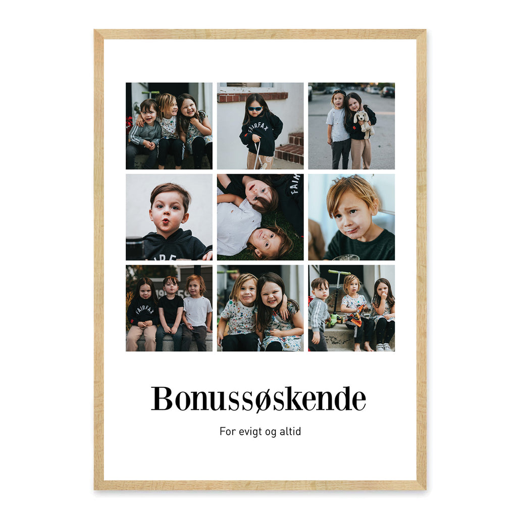 En kærlig plakat skabt til bonussøskende, som fejrer det særlige bånd og de minder, I deler sammen. Den hylder støtte, fællesskab og de små øjeblikke, der gør jeres relation unik. Plakaten kan tilpasses med jeres egne 6 eller 9 billeder, en personlig overskrift og tekst, som fanger jeres historie og de oplevelser, I værdsætter sammen.