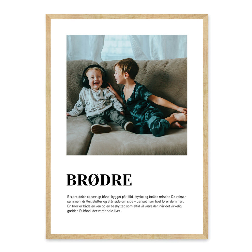 Plakaten kan tilpasses med ét eller fire af jeres egne billeder, så den bliver et personligt og rørende minde om jeres fælles rejse. Du kan vælge mellem færdigskrevne tekster eller skrive din egen for at gøre udtrykket helt unikt. Den er en oplagt gave til fødselsdage, jul, konfirmationer eller som en kærlig overraskelse til søskendeflokken. Det enkle, nordiske design gør den nem at integrere i ethvert hjem og giver et tidløst udtryk, der hylder brødrenes bånd mange år frem.
