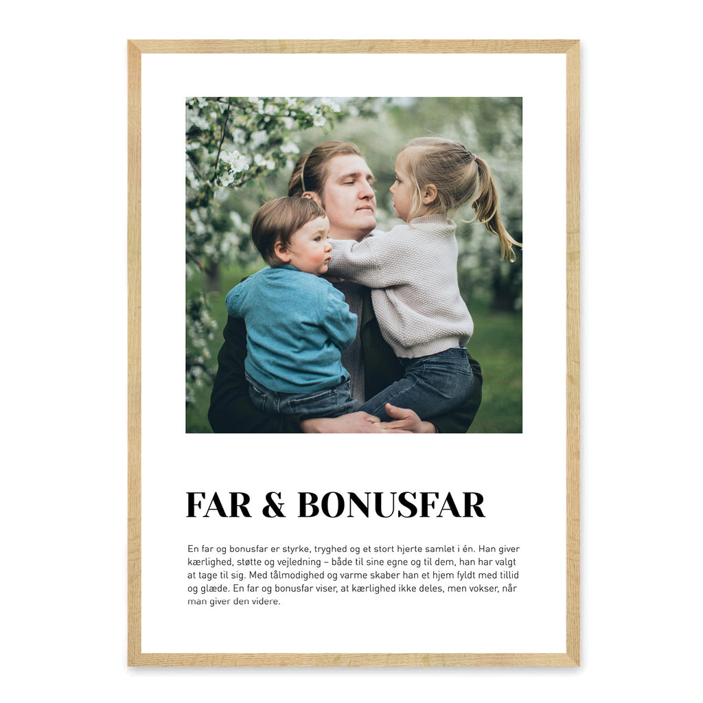 En Far/Bonusfar-plakat er en kærlig måde at hylde den helt særlige mand, der har en vigtig rolle i dit liv – uanset om han er din biologiske far, bonusfar eller begge dele. Den fremhæver minder, grin og små øjeblikke af nærhed, der viser hans omsorg, støtte og betydning gennem årene. Plakaten er en smuk måde at sige tak og vise, hvor meget han betyder for dig.