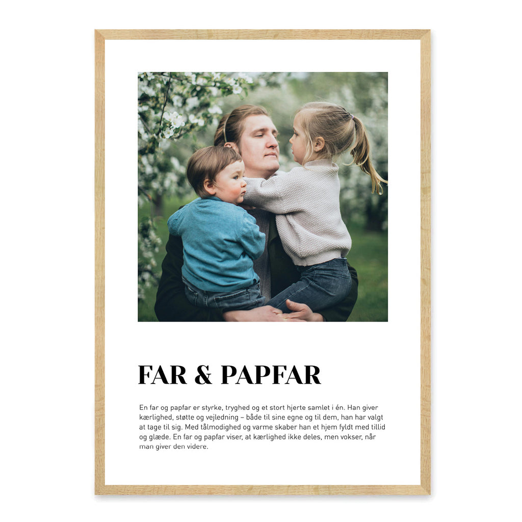 En Far/Papfar-plakat er en kærlig måde at hylde den mand, der både er far og papfar i dit liv. Den fanger de små øjeblikke, grin og minder, som har formet jeres relation – både dem fra de tidlige år og dem, der er kommet til senere. Plakaten viser, hvor meget hans støtte, omsorg og tilstedeværelse betyder, og hvor stor en rolle han spiller som en af de vigtigste personer i familien.