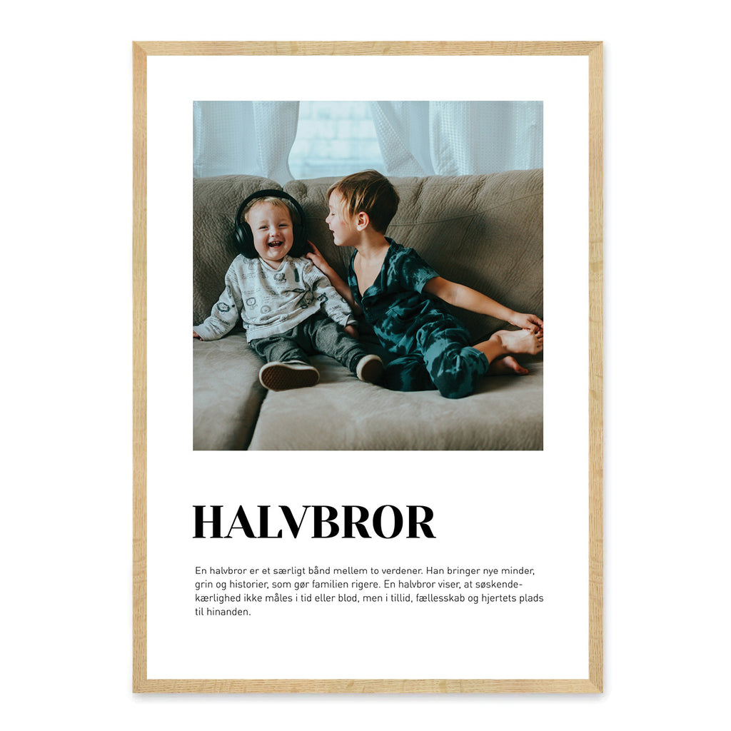 Gør plakaten personlig ved at vælge en færdig tekst eller skrive din egen, og upload ét eller fire billeder, der fortæller jeres historie. En oplagt gaveidé til fødselsdag, jul eller som en varm og personlig overraskelse, der viser, hvor meget din halvbror betyder for dig. Det stilrene, nordiske design gør den til et tidløst minde, der kan pryde ethvert hjem.