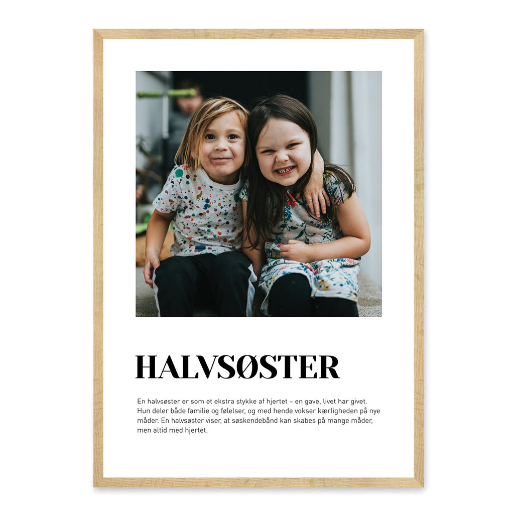 En Halvsøster-plakat er en kærlig måde at hylde den helt særlige relation, du har til din halvsøster – uanset om I har delt hele barndommen eller først er blevet tættere senere i livet. Den fremhæver de minder, grin og små øjeblikke af nærhed, der binder jer sammen som familie. Plakaten er en smuk måde at vise, hvor meget hun betyder for dig, og hvilken vigtig rolle hun spiller i dit liv.