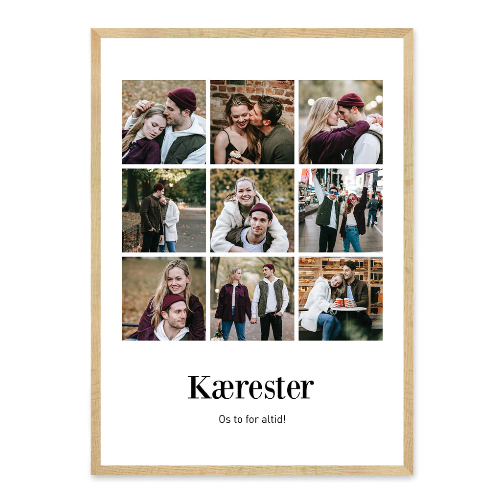 En charmerende og personlig plakat til din kæreste, som fejrer jeres kærlighed og de minder, I har skabt sammen. Den indfanger både de små hverdagshøjdepunkter og de store øjeblikke, der gør jeres forhold unikt. Plakaten kan designes med dine egne 6 eller 9 billeder, en personlig overskrift og tekst, så den bliver et smukt og meningsfuldt minde om jeres tid sammen.
