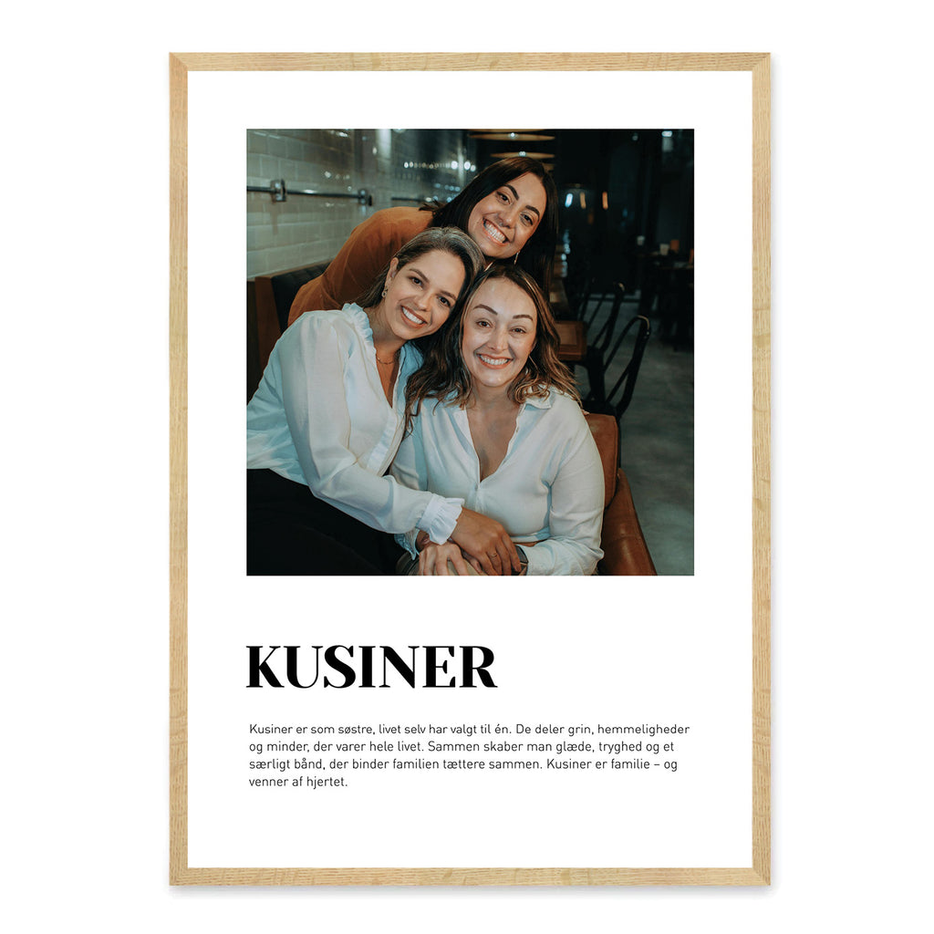 En Kusiner-plakat er en smuk måde at hylde det særlige bånd, du deler med dine kusiner – hvad enten I er vokset op som søstre, eller jeres relation er vokset frem gennem årene. Den indfanger de fælles minder, grin og øjeblikke af nærhed, som gør jeres familieforhold helt unikt. Plakaten er en kærlig måde at vise, hvor meget dine kusiner betyder, og hvilken vigtig plads de har i dit liv.