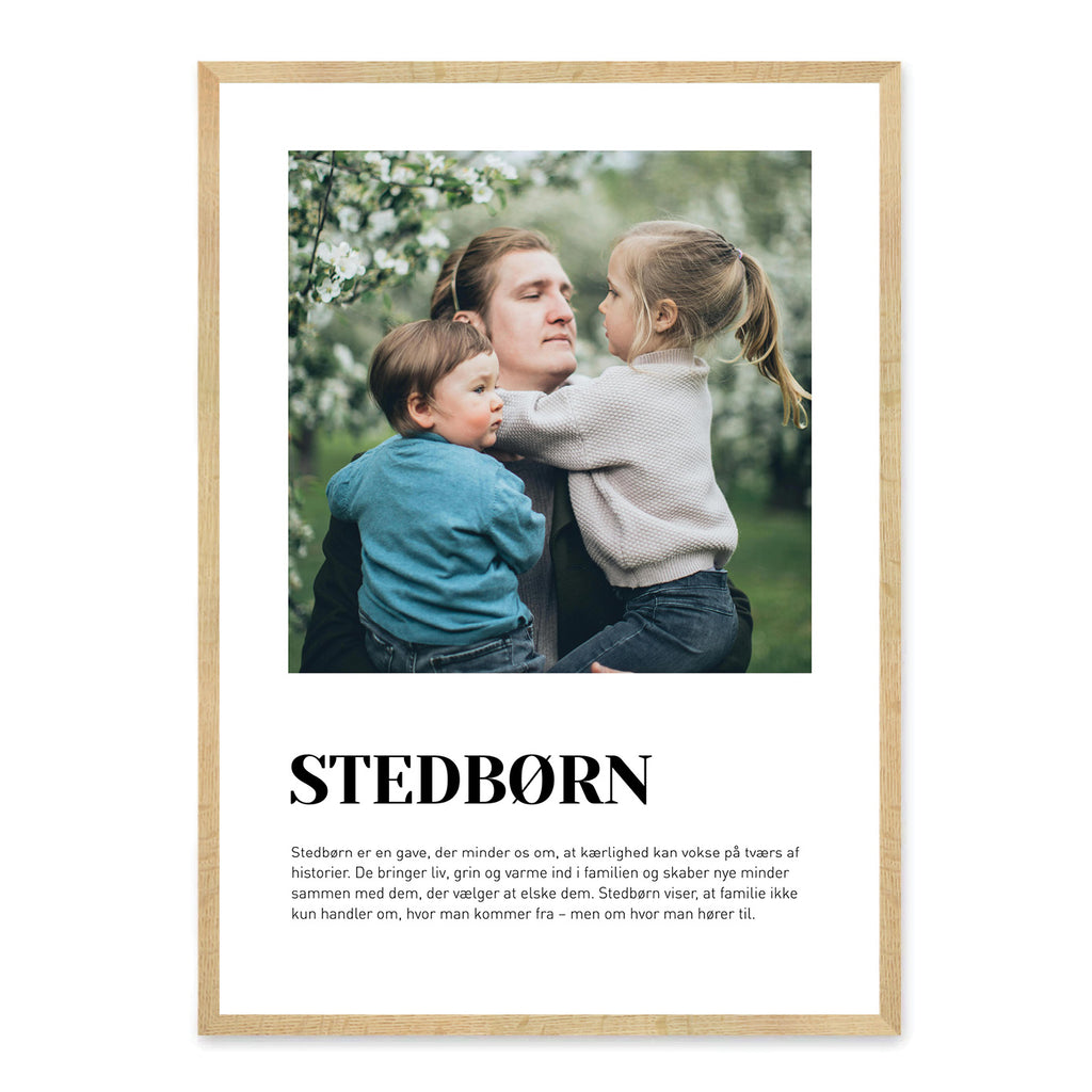 Gør plakaten personlig ved at vælge en færdig tekst eller skrive din egen, og upload ét eller flere billeder, der fortæller jeres historie. En oplagt gaveidé til fødselsdag, jul eller som en varm og personlig overraskelse, der viser, hvor meget dine stedbørn betyder for dig. Det stilrene, nordiske design gør den til et tidløst minde, der kan pryde ethvert hjem.