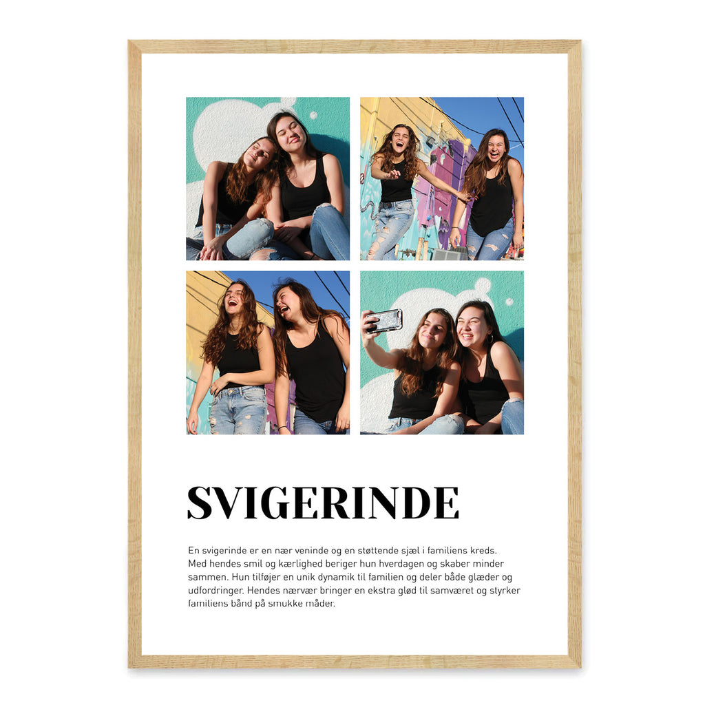En Svigerinde-plakat er en smuk måde at hylde det særlige bånd til din svigerinde. Den symboliserer nærvær, varme og det venskab og familiebånd, der vokser gennem fælles oplevelser og gode minder.