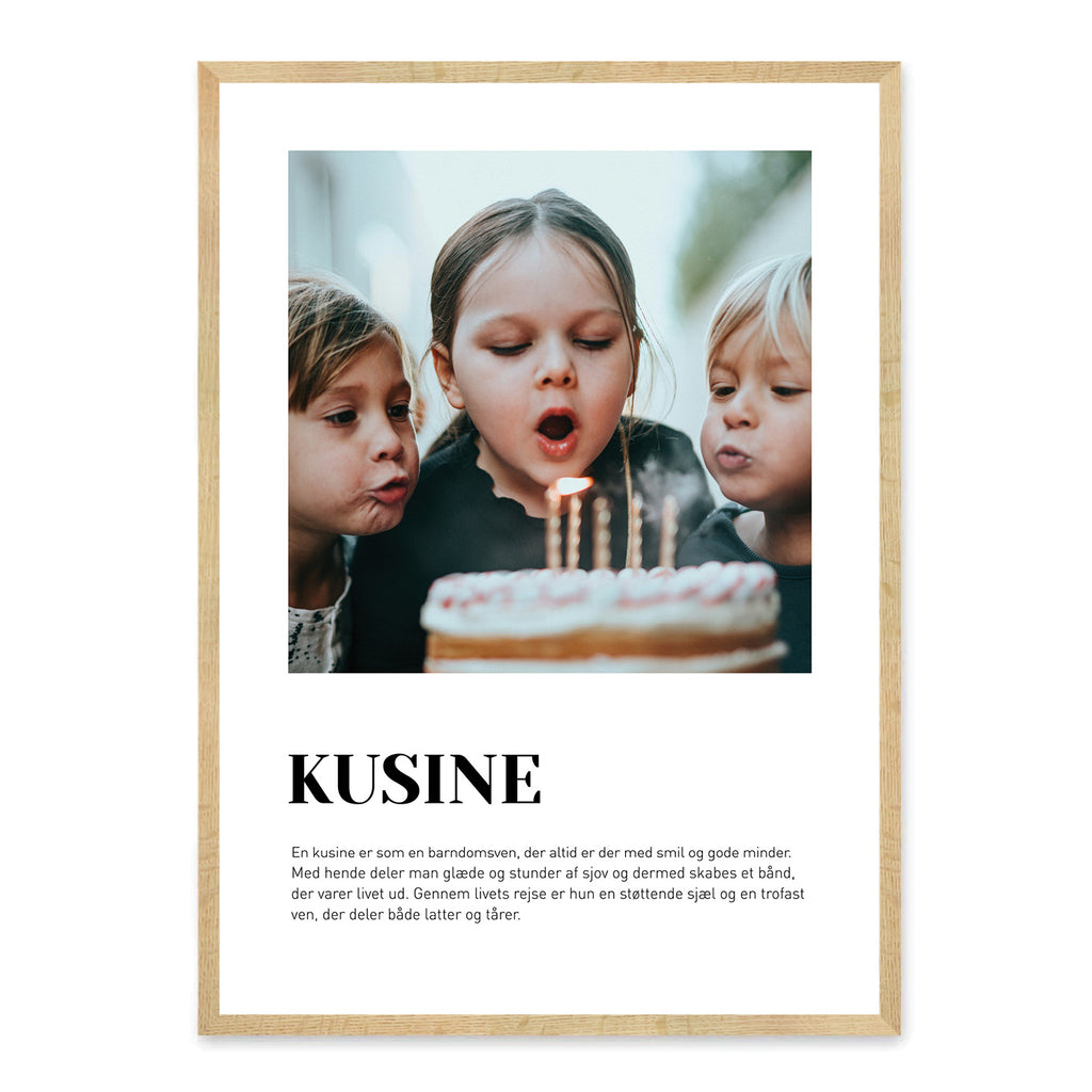En Kusine-plakat er en kærlig måde at hylde den unikke relation, du har til din kusine – uanset om I har været tætte hele livet eller er vokset sammen gennem årene. Den indfanger de minder, grin og små øjeblikke af nærhed, der binder jer sammen og gør jeres bånd helt særligt. Plakaten er en smuk måde at vise, hvor meget hun betyder, og hvor stor en forskel hun gør i dit liv.