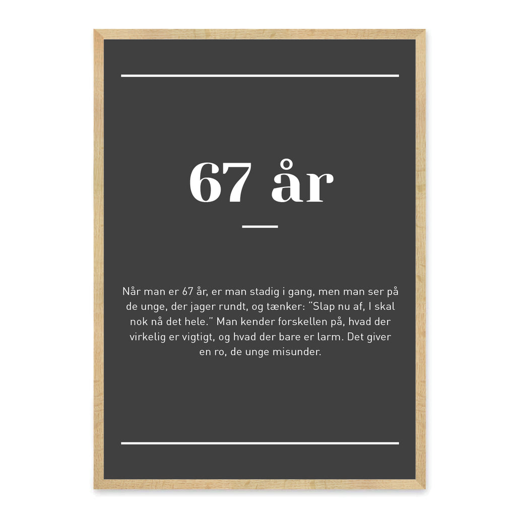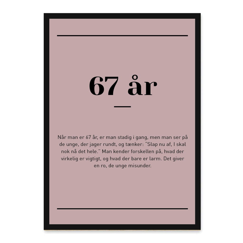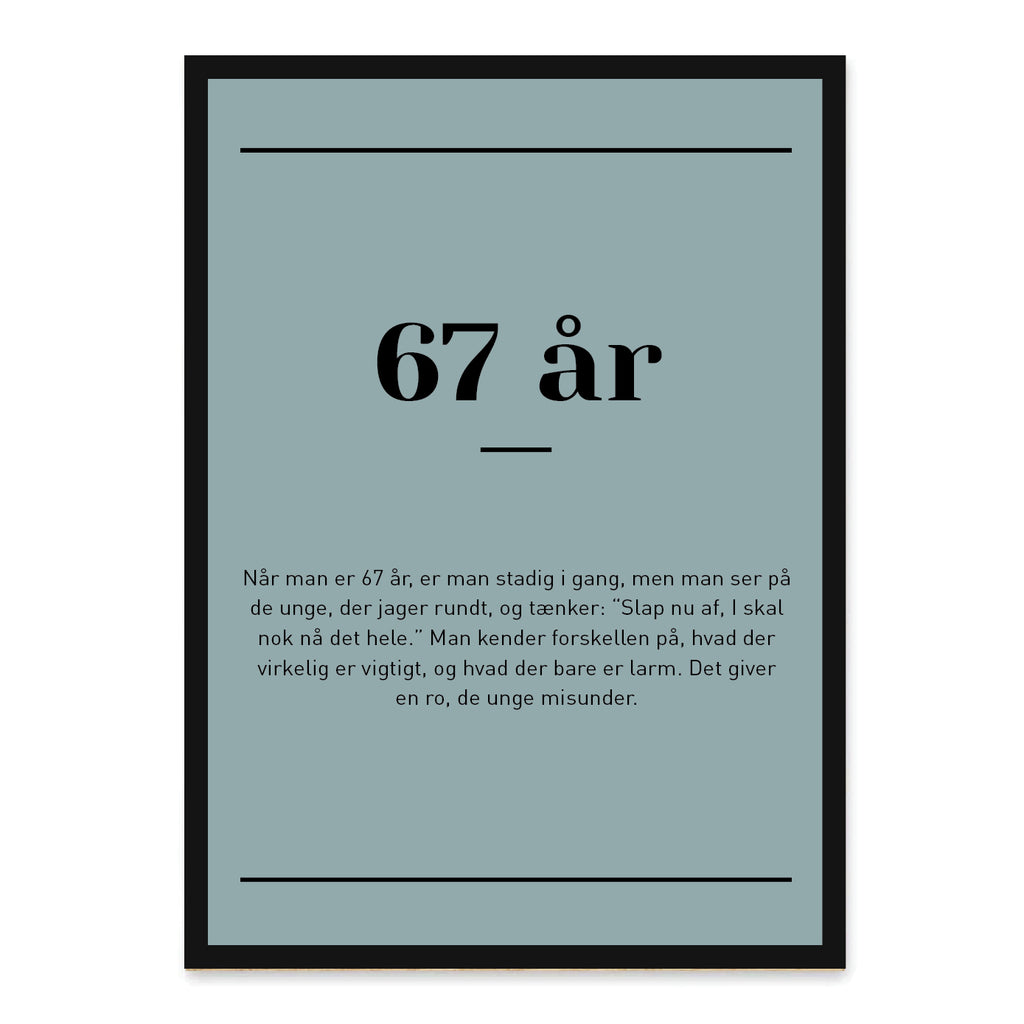 67 år – en alder hvor livsvisdom og livsglæde går hånd i hånd. Man har oplevet det meste, men stadig lyst til at grine, nyde og tage livet, som det kommer. Denne plakat fanger med varme, humor og et strejf af selvironi essensen af at være 67 – rolig, erfaren og fuld af livsmod.