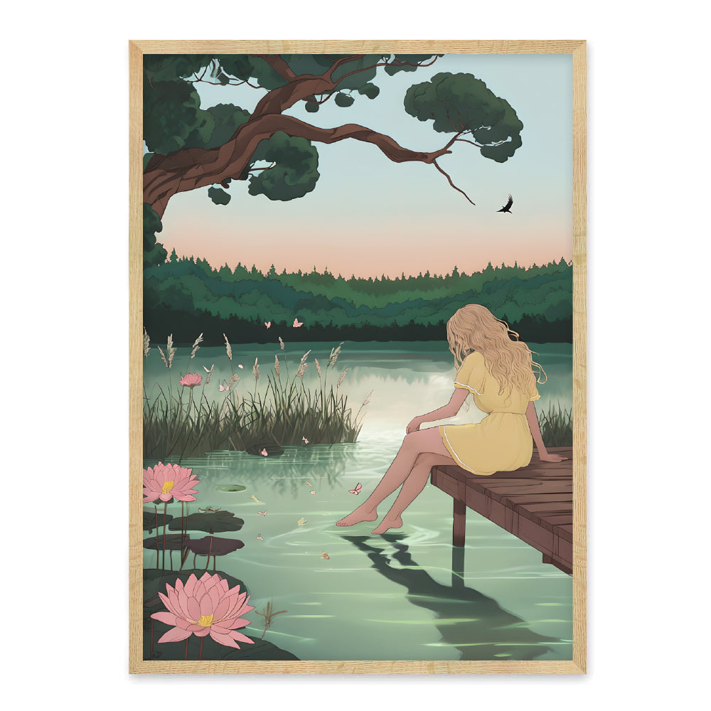 Danmark plakat - Plakat med pige på badebro ved sø med åkander