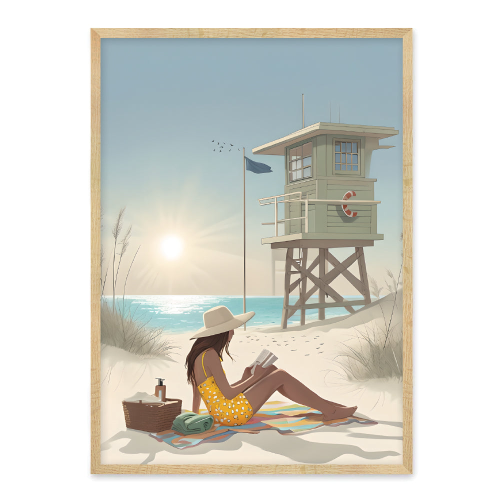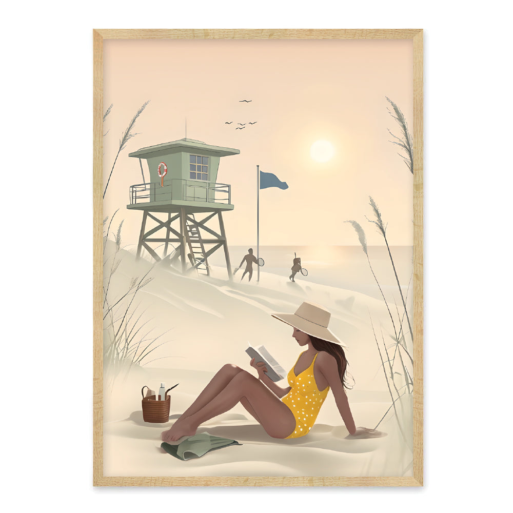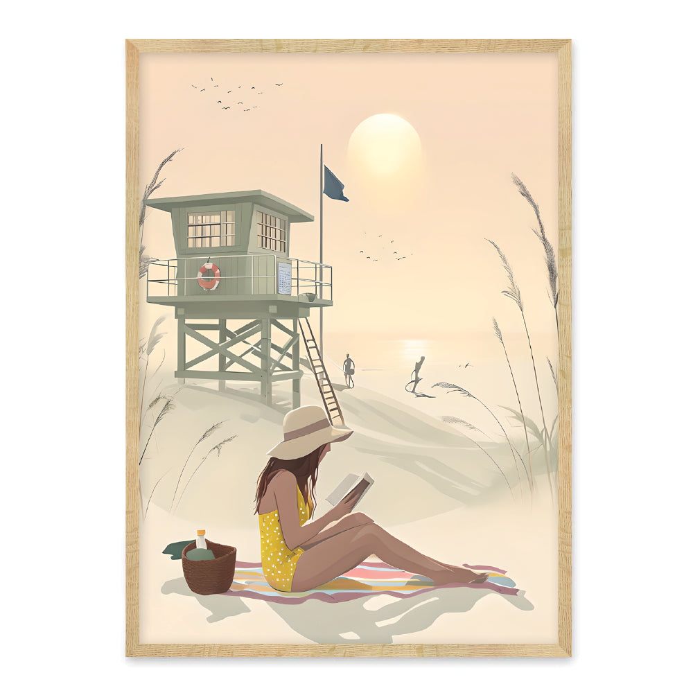 Danmark plakat - Plakat af kvinde på stranden med solhat og bog