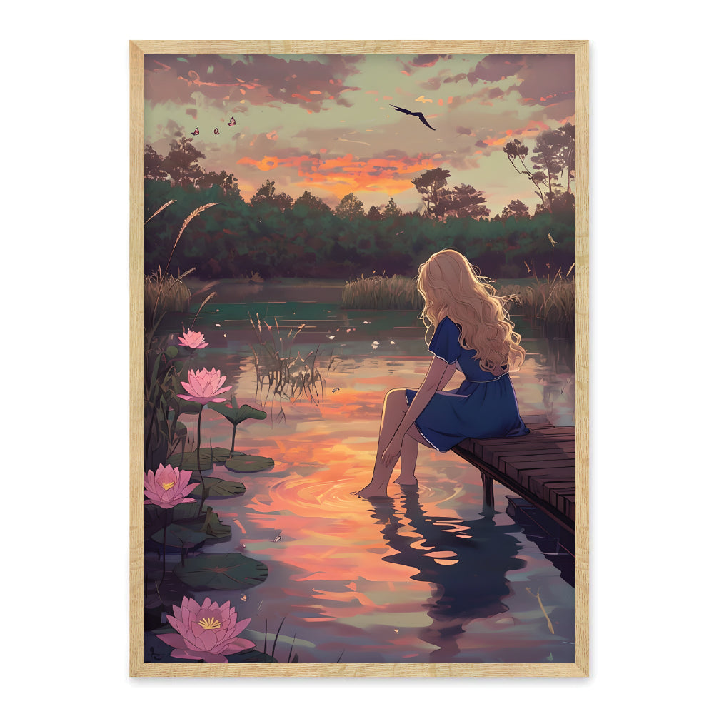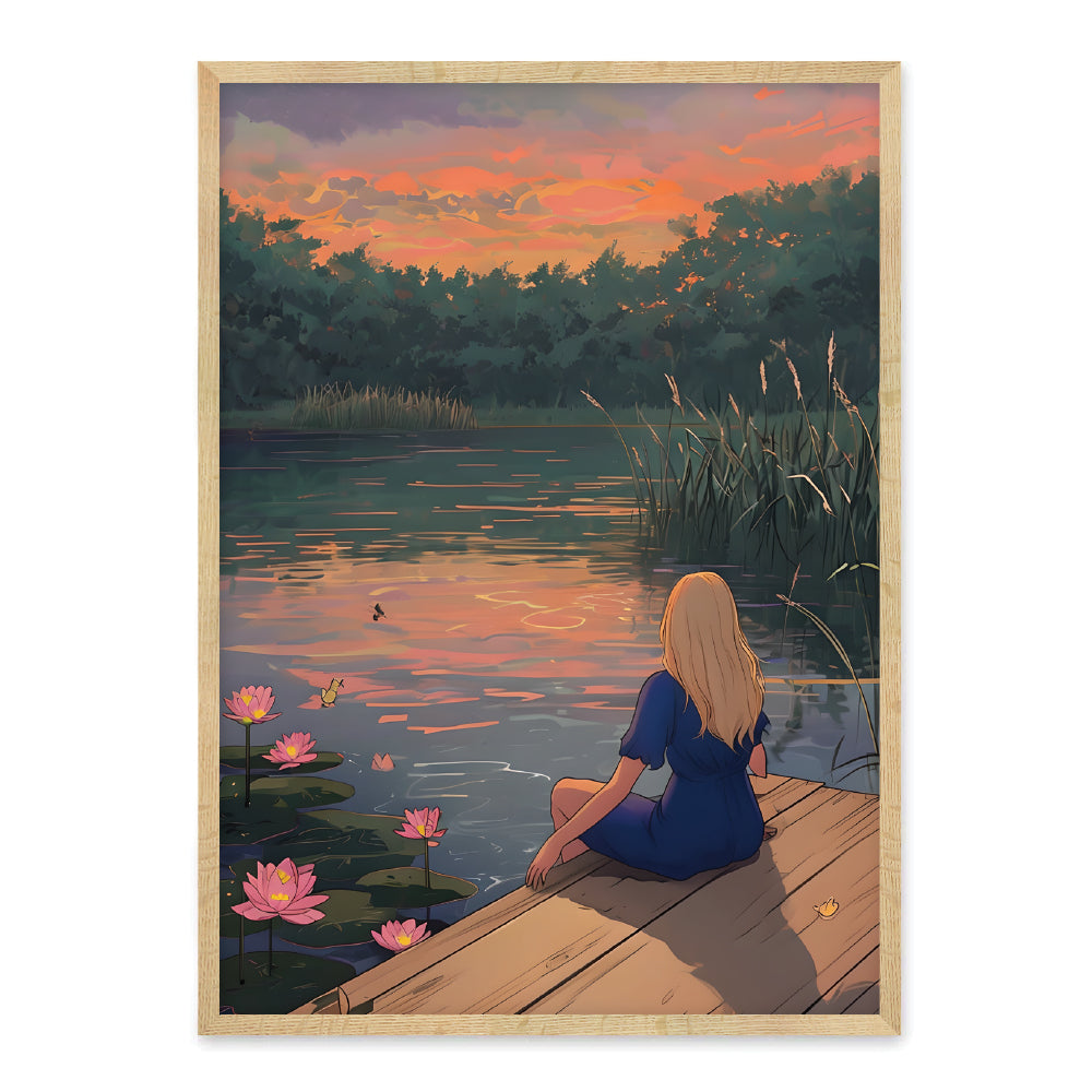 Danmark plakat - Plakat med kvinde på badebro ved sø i solnedgang
