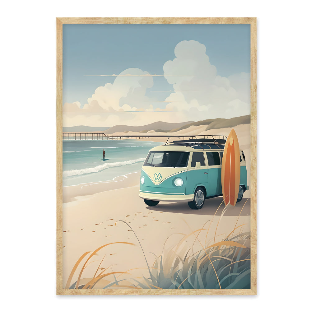 Danmark plakat - Plakat med folkevognsrugbrød og surfbræt på stranden