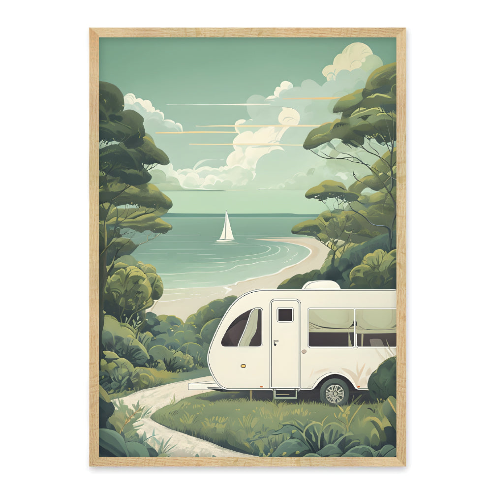Danmark plakat - Plakat af hvid campingvogn ved strand