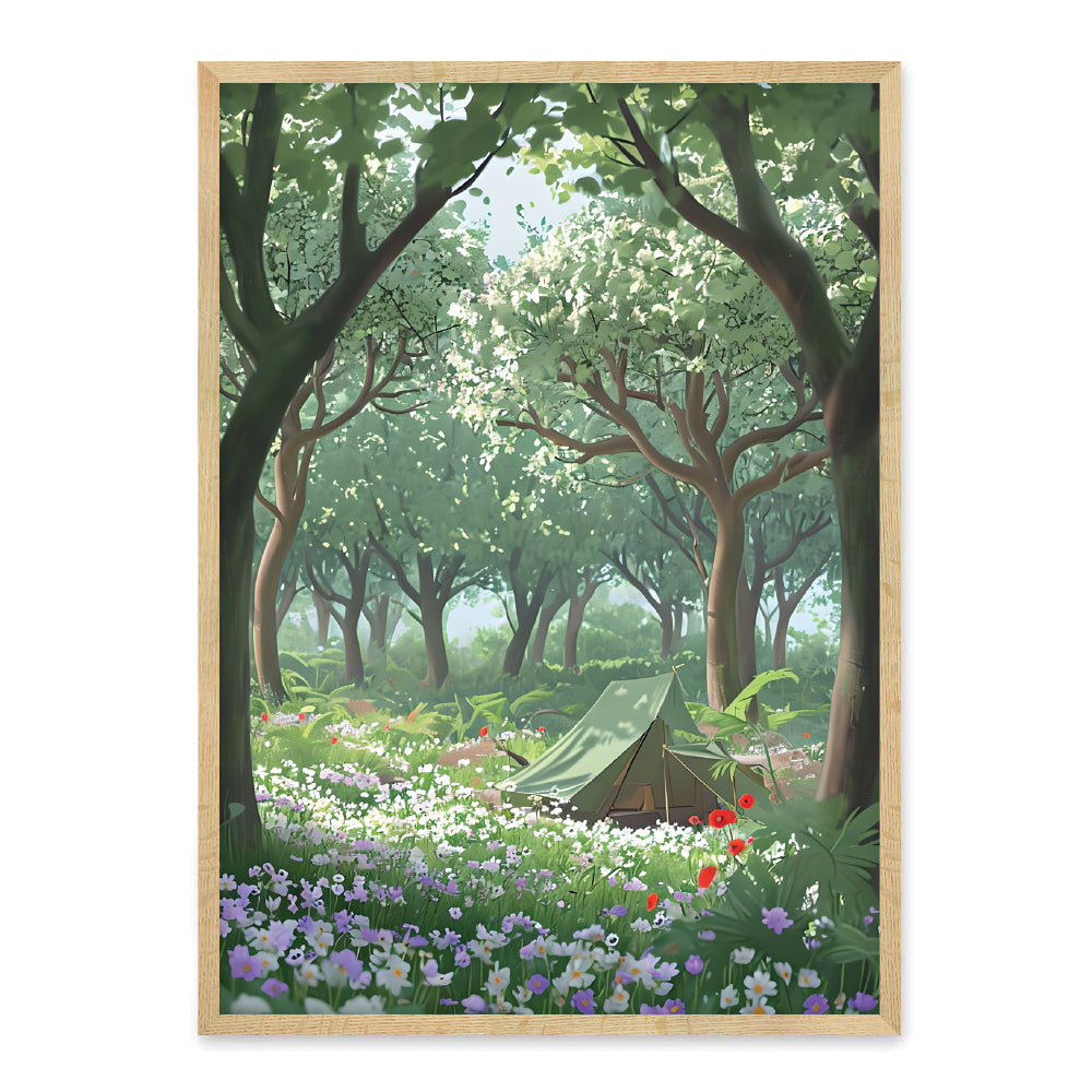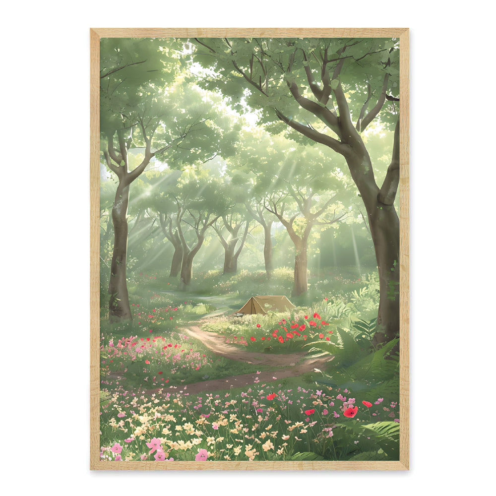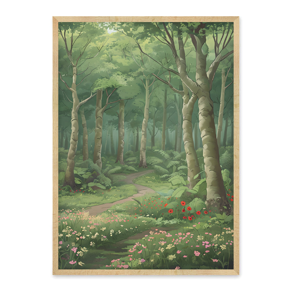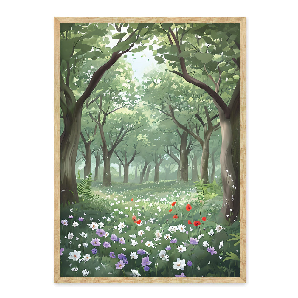 Danmark plakat - Plakat af skov med mørke træer og farverige blomster