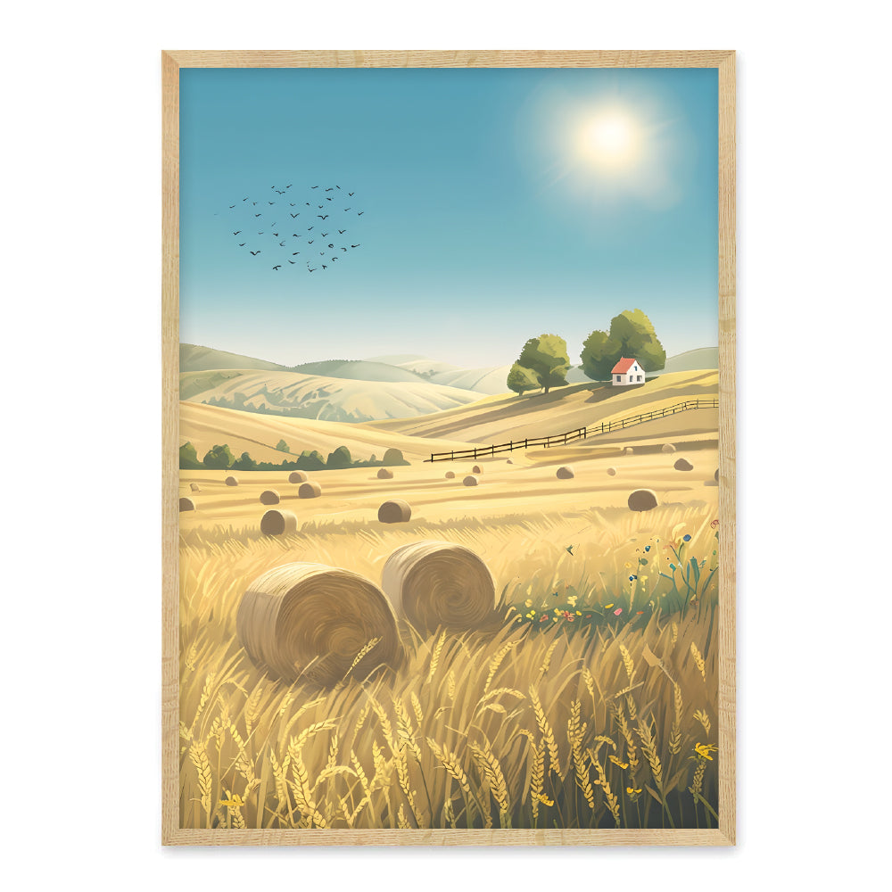 Danmark plakat - Plakat af kornmark med halmballer og hvidt hus