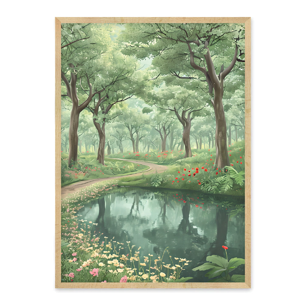 Danmark plakat - Plakat af skovsti med sø og blomster