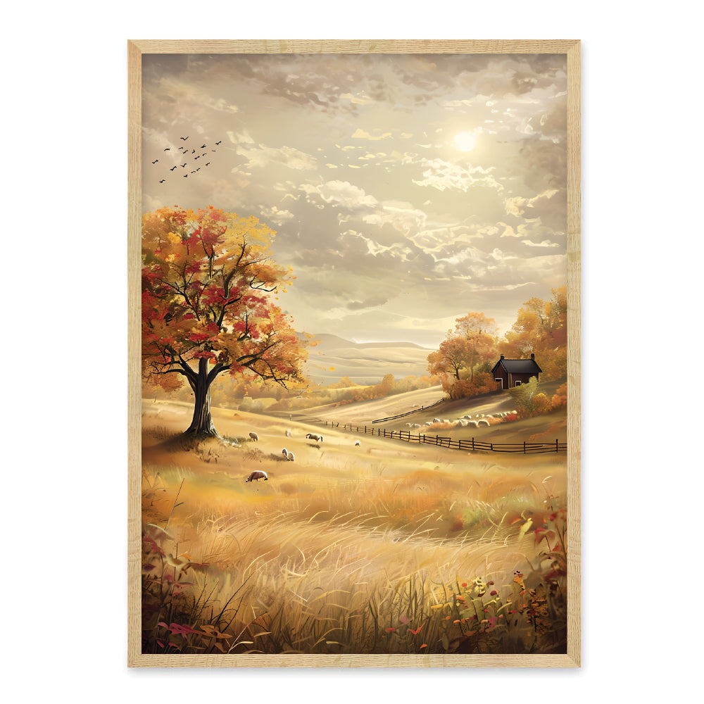 Danmark plakat - Plakat af efterårslandskab med marker, får og hus