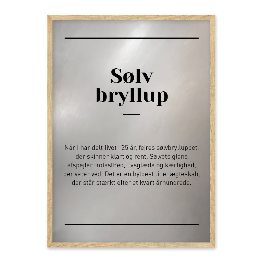 Denne plakat er en smuk gaveidé til at markere sølvbrylluppet. Den kan gives som en personlig gave til din ægtefælle eller som en mindeværdig gave til sølvbrudeparret – et varigt minde om deres stærke kærlighed og fælles livsrejse.