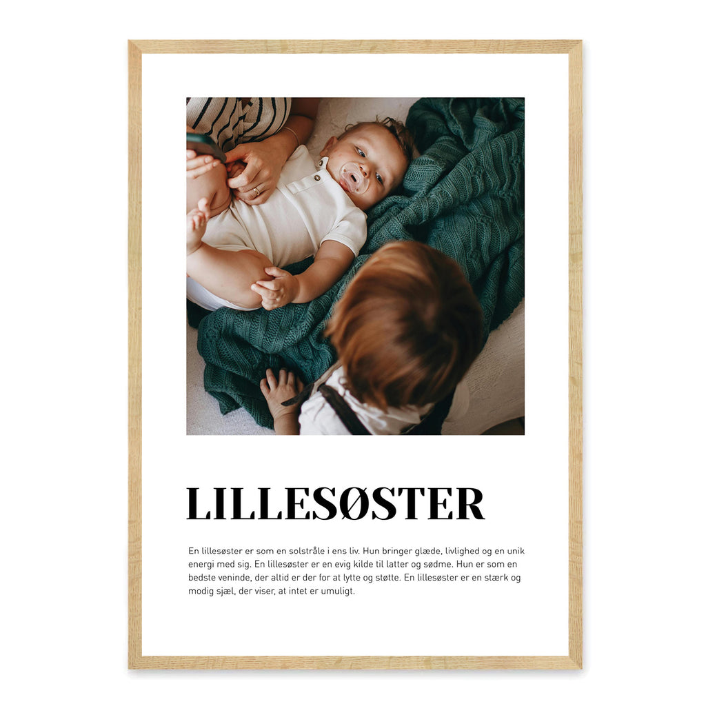 En Lillesøster-plakat er en kærlig måde at hylde det særlige bånd, du deler med din lillesøster – uanset om hun altid har været familiens lille solstråle, din bedste ven eller den, du har fulgt og passet på gennem årene. Den indfanger de minder, grin og små øjeblikke, der gør jeres søskendeforhold helt unikt. Plakaten er en smuk måde at vise, hvor meget hun betyder for dig, og hvilken vigtig plads hun har i dit liv.