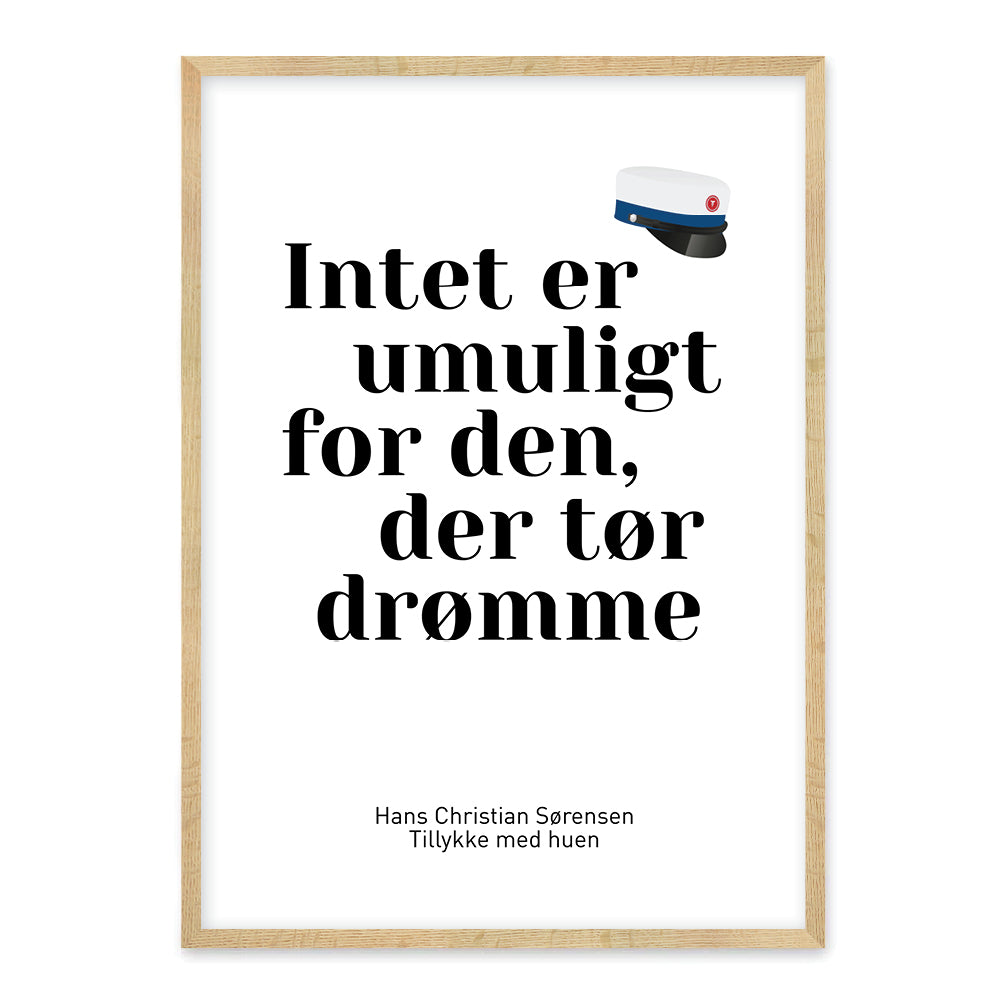 Vælg mellem 5 forskellige studenterhuer, der hver især hylder traditionen på sin egen måde – fra klassisk til moderne stil. Du kan også vælge ét af 5 nøje udvalgte citater, som både kan være sjove, inspirerende eller hjertevarme, og som sætter prikken over i’et på en mindeværdig gave. Det er en oplagt måde at fejre en stor bedrift på og samtidig give en personlig gave, der kan hænge på væggen og minde om en vigtig milepæl i livet.