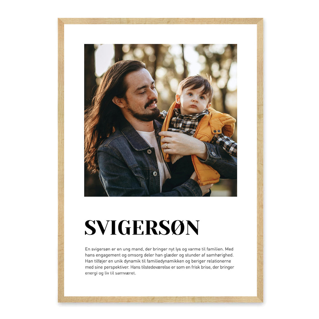 Gør plakaten personlig ved at vælge en færdig tekst eller skrive din egen, og upload ét eller fire billeder, der fortæller jeres historie. En oplagt gaveidé til fødselsdag, jul eller som en varm og personlig overraskelse, der viser, hvor meget din svigersøn betyder for dig. Det stilrene, nordiske design gør den til et tidløst minde, der kan pryde ethvert hjem.
